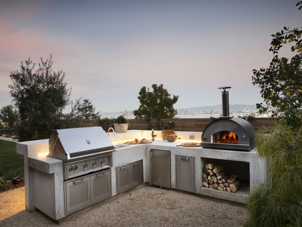 BBQ Season Outdoor kitchens create a space to gather in your garden. Above, we created a well-equipped kitchen, including a sink, pizza oven, fridge, trash compactor and grill. The kitchen is made of white concrete and an L shape to maximize the corner and views.  Here we added plants of varying height behind the bar top.