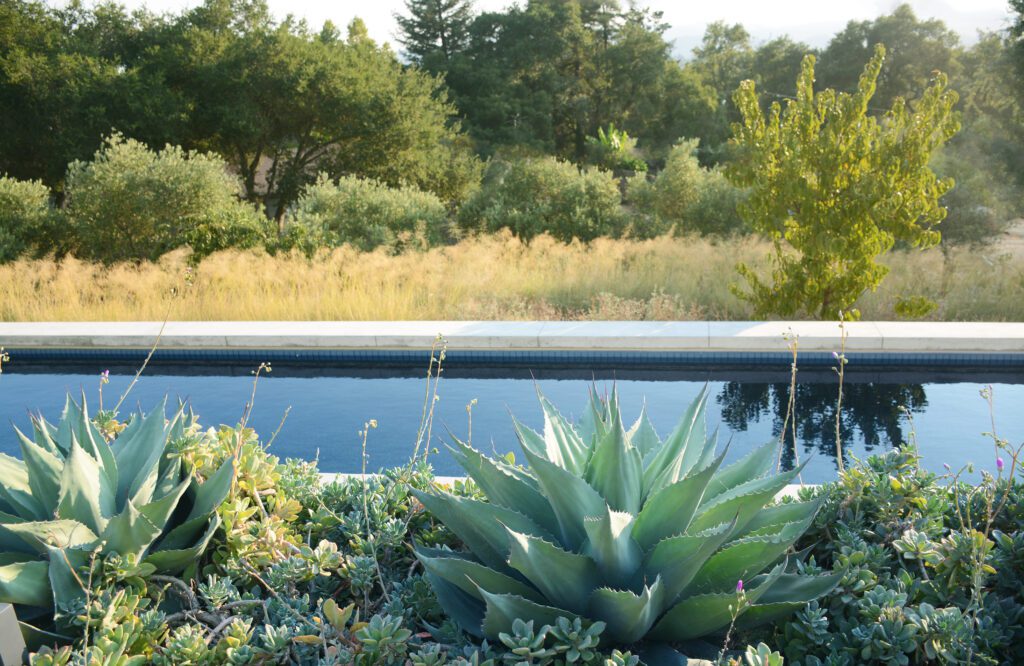 For no low-maintenance landscapes, we placed native grasses (above) and succulents beside the pool (right).